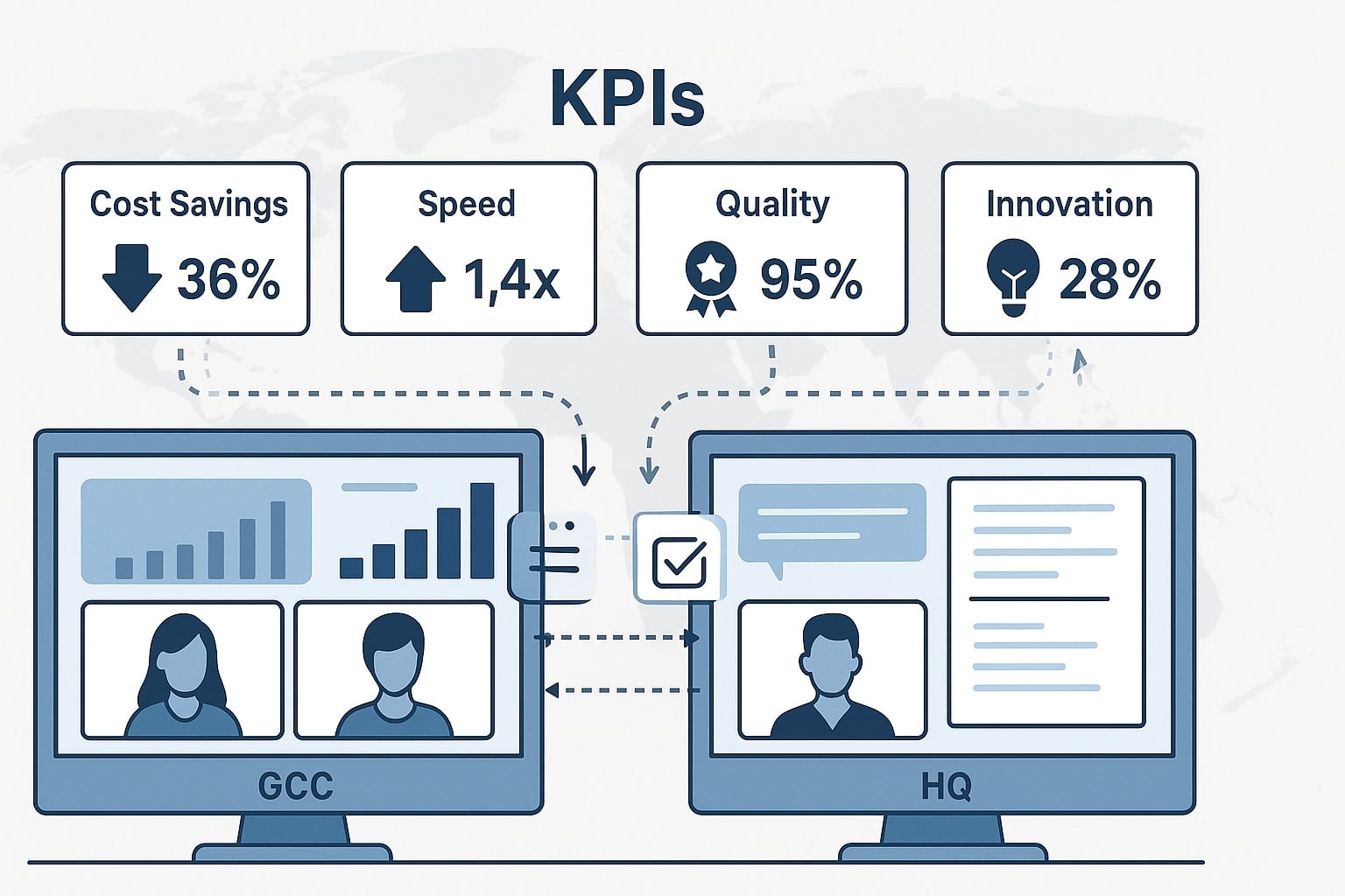 A fit-for-purpose operating model ties structure, governance, and processes together. Agree on how decisions are made, which metrics matter, and how disputes are handled. Set up steering committees, operating reviews, and joint planning forums involving both GCC and onshore leaders.