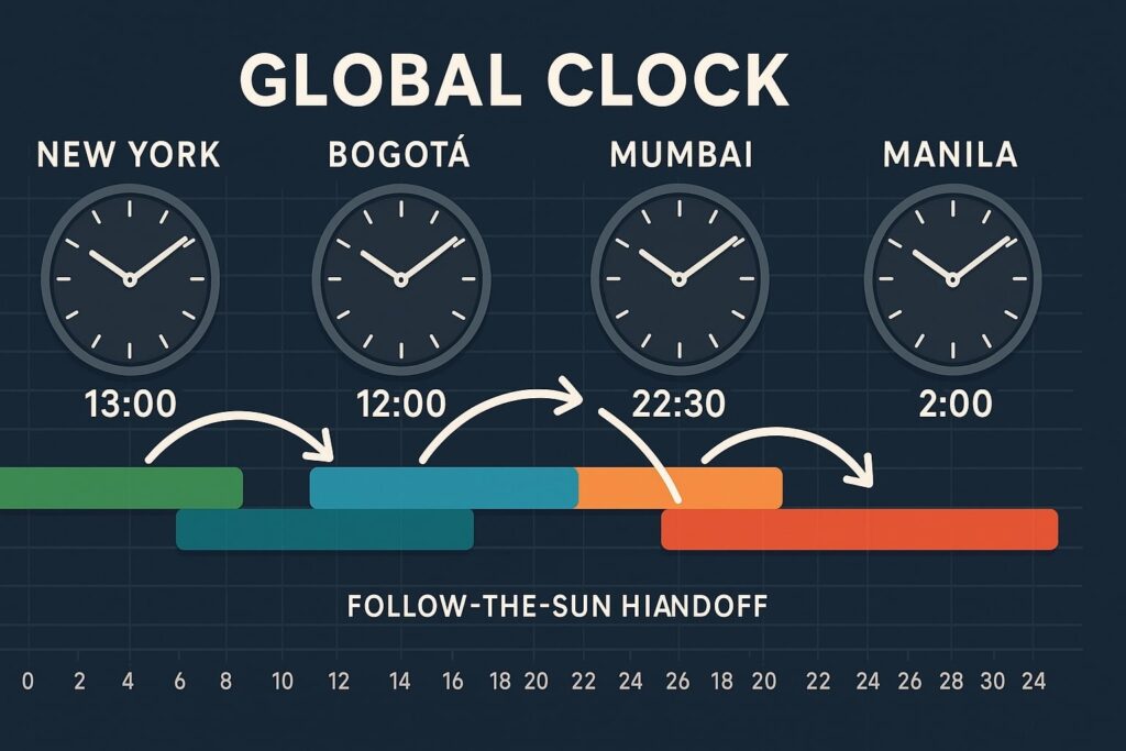 One common approach is the follow-the-sun model, where different sites handle different time bands. For example, a center in Manila may handle daytime hours for Asia-Pacific, while a center in Bogotá covers Americas evenings. Clear handover notes and shared systems ensure customers experience a seamless service, even as teams change.