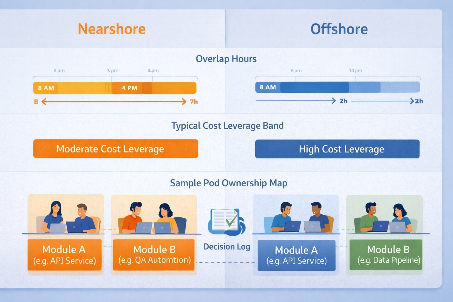 Nearshore teams often reduce decision latency because overlap hours are higher, which can help with discovery-heavy work. Offshore teams often unlock larger cost advantages and larger talent pools in certain markets, which can help with scaling execution. Both models can deliver high quality when ownership is clear and engineering standards are consistent.
